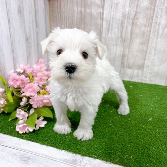ホワイト 鮮やかな白いコートが特徴的です。2層のダブルコートとも白色でミニチュアシュナウザーの中では比較的珍しい毛色と言われています。特に目元は涙や目やにによって変色しやすいためこまめなお手入れが必要です。