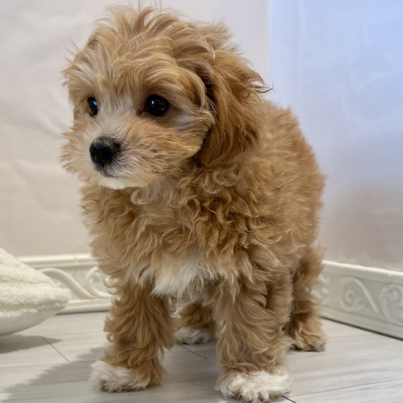 毛色はアプリコットですが、胸元や足元が白くて靴下みたい!オシャレしてどこ行くの~(笑)😊