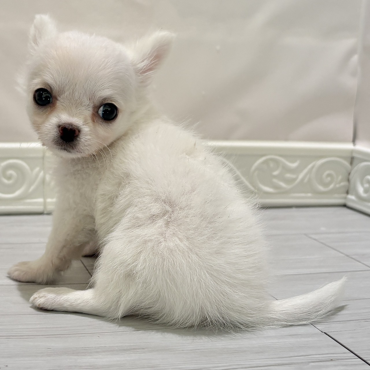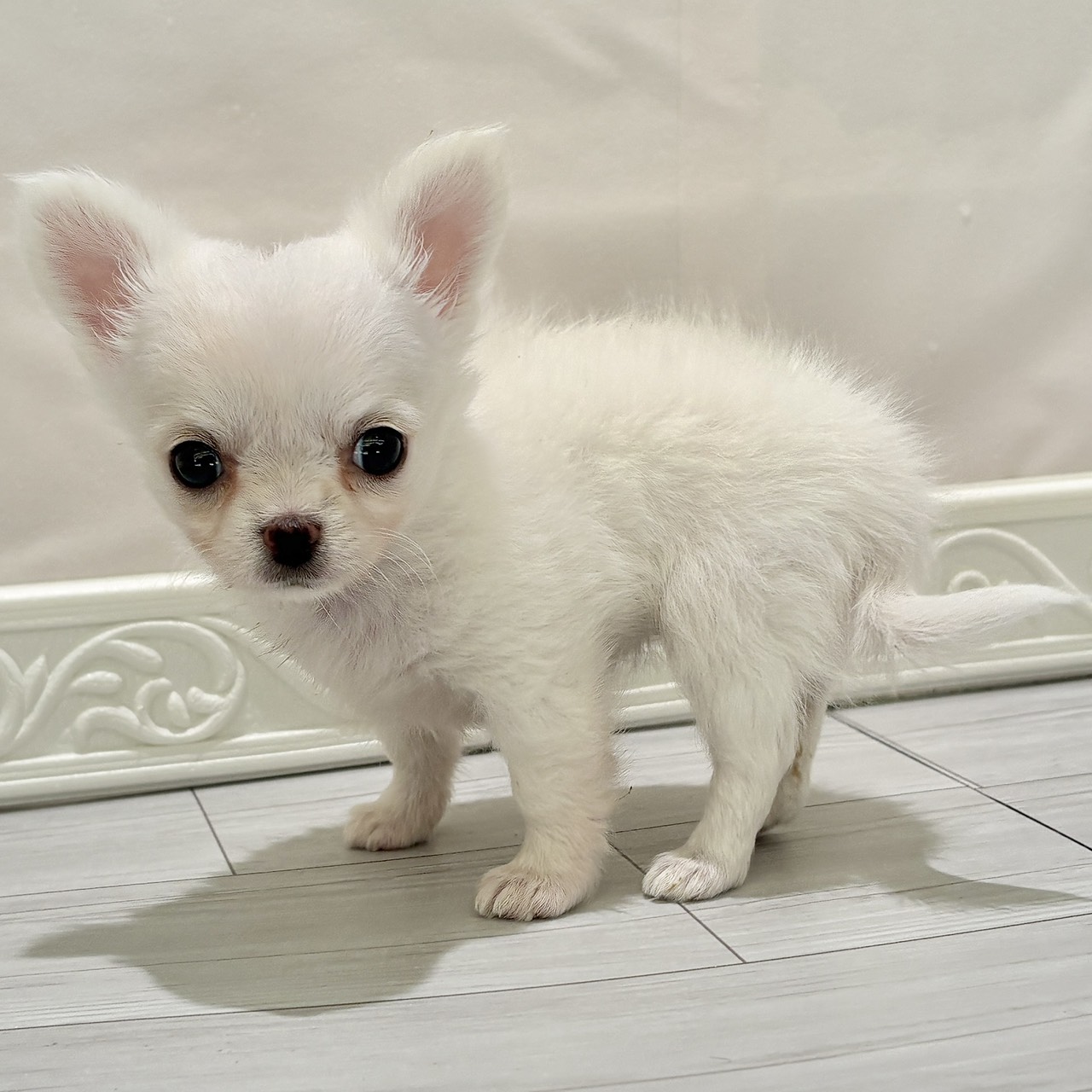 真っ白な毛色が美しいチワワちゃん!!雪みたいに白いですね❄