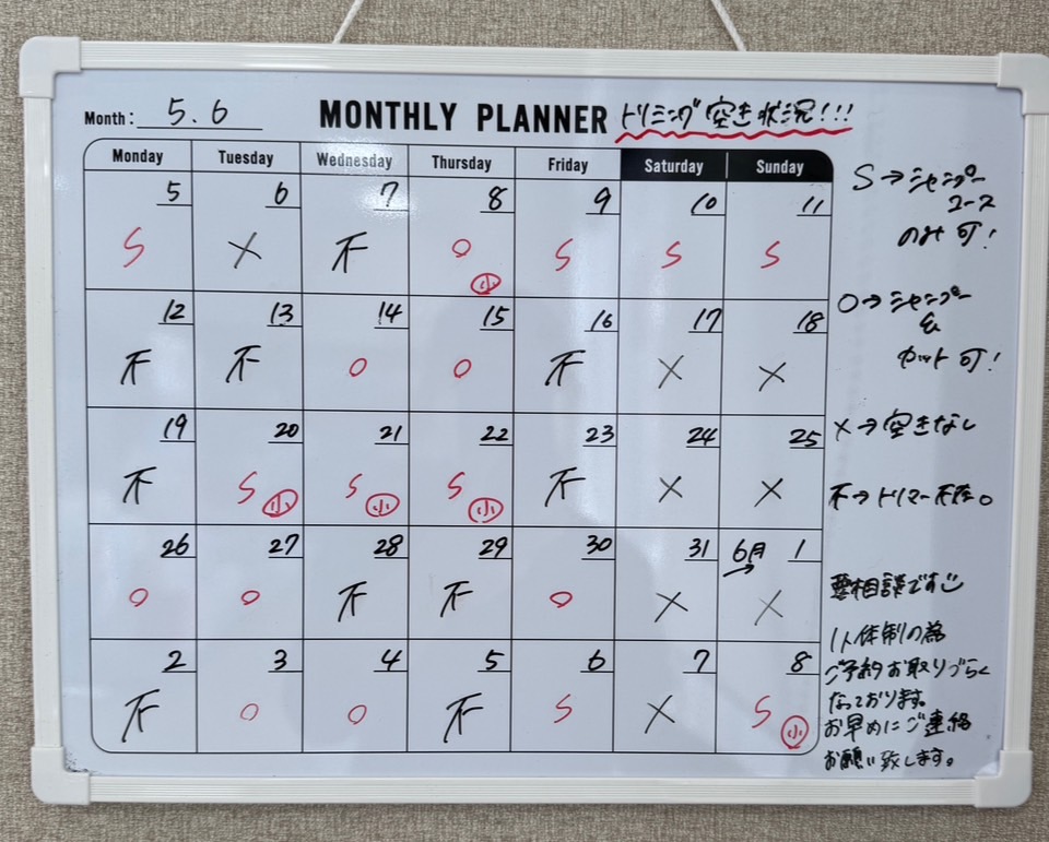※5月からトリマーが一人体制となります為、ご予約お取りづらくなっております