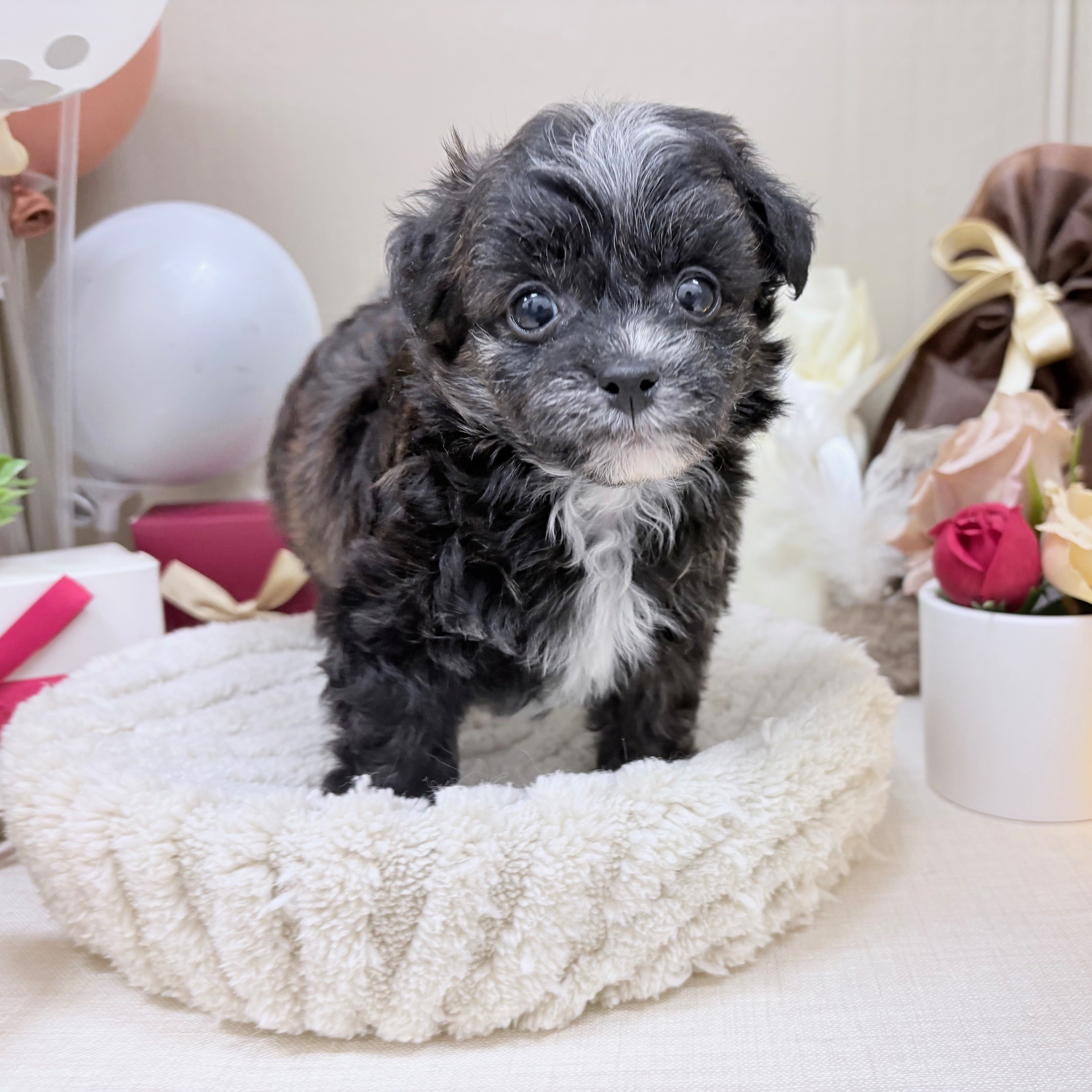 以前からワンチャンをお迎えしたいという想いがありました。ネットでショップのワンちゃんを拝見させていただき、モモに一目惚れしすぐに問い合わせさせていただきました。数日後ショップへ行き、モモに逢えた瞬間「やっぱりこの仔しかいない」と直感で感じ、お迎えすることを決めました。担当してくださったスタッフさんも素敵な方で、